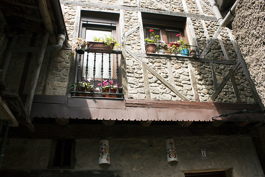 Fachas con entramado de madera (llamados tramones), con pocos huecos y un solo voladizo que recibe al piso superior, con múltiples piezas diagonales de madera. En la parte inferior se utiliza mampostería o sillería para el anclaje de los canes, o bien, a base de apoyos en vigas imprentas sobre las que apoyan los canes y que se recubren de pequeñas piedras y mampostería. El entramado de madera se suele realizar con castaño y las vigas de gran tamaño el roble.